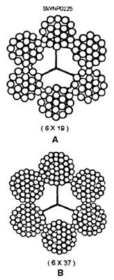 Figure 5-6.-A. 6 by 19 wire rope; B. 6 by 37 wire rope. usual. The wires in the 6 by 37 are smaller than the wires in the 6 by 19 wire rope and, consequently, will not stand as much abrasive wear. |