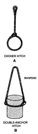 Figure 6-14.-Endless sling rigged as a choker hitch. A SINGLE-LEG SLING, commonly referred to as a strap, can be made by forming a spliced eye in each end of a piece of fiber line or wire rope. Sometimes the ends of a piece of wire rope are spliced into eyes around thimbles, and one eye is fastened to a hook with a shackle. With this arrangement, the shackle and hook are removable. The single-leg sling maybe used as a choker hitch (fig. 6-15, view A) in hoisting by passing one eye through the other eye and over the hoisting hook. The single-leg sling is also useful as a double-anchor hitch (fig. 6-15, view B). The double-anchor hitch works