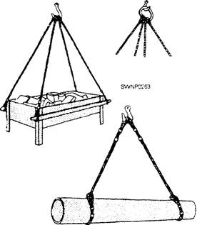 Figure 6-15.-Methods of using single-leg slings. well for hoisting drums or other cylindrical objects where a sling must tighten itself under strain and lift by friction against the sides of the object. Single-leg slings can be used to make various types of BRIDLES. Three common uses of bridles are shown in figure 6-16. Either two or more single slings may be used for a given combination. The bridle hitch provides excellent load stability when the load is distributed equally among each sling leg, the load hook is directly over the center of gravity of the load, and the load is raised level. The use of bridle slings requires that the sling angles be carefully determined to ensure that the individual legs are not overloaded. NOTE: It is wrong to conclude that a three- or four-leg bridle will safely lift a load equal to the safe load on one leg multiplied by the number of legs. This is because there is no way of knowing that each leg is carrying its share of the load. With a four-legged bride sling lifting a rigid load, it is possible for two of the legs to support practically the full load while the other two legs only balance it. COMSECOND/COMTHIRDNCB strongly recommend that the rated capacity for two-leg bridle slings listed in the COMSECOND/COMTHIRDNCBINST 11200.11 be used also as the safe working load for three- or four-leg bridle hitches.