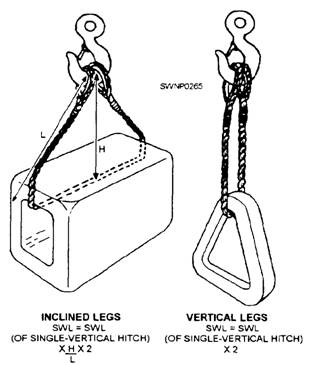 SLING SAFE WORKING LOADS There are formulas for estimating the loads in most sling configurations. These formulas are based on the safe working load of the single-vertical hitch of a particular sling. The efficiencies of the end fittings used also have to be considered when determining the capacity of the combination. The formula used to compute the safe working load (SWL) for a BRIDLE HITCH with two, three, or four legs (fig. 6-17) is SWL (of single-vertical hitch) times H (Height) divided by L (Length) times 2 = SWL. When the sling legs are not of equal length, use the smallest H/L measurement. This formula is for a two-leg bridle hitch, but it is strongly recommended it also be used for the three- and four-leg hitches. NOTE: Do NOT forget it is wrong to assume that a three- or four-leg hitch can safely lift a load equal to the safe load on one leg multiplied by the number of legs. Other formulas are as follows: Single-basket hitch (fig. 6-18): For vertical legs: SWL = SWL (of single-vertical hitch) x 2. For inclined legs: SWL = SWL (of single-vertical hitch) x H divided by Lx4. Double-basket hitch (fig. 6-19): For vertical legs: SWL = SWL (of single-vertical hitch) x 4. For inclined legs: SWL = SWL (of single-vertical hitch) x H divided by Lx4. Single-choker hitch (fig. 6-20): For sling angles of 45 degrees or more: SWL = SWL (of single-vertical hitch) x 3/4 (or .75). Sling angles of less than 45 degrees are not recommended; however, if they are used, the formula is as follows: SWL = SWL (of single-vertical hitch) x A/B. Double-choker hitch (fig. 6-21): For sling angle of 45 degrees or more: SWL = SWL (of single-vertical hitch) x 3 divided by4xHdivided byLx2. Sling angles of less than 45 degrees: SWL = SWL (of single-vertical hitch) x A divided byBxHdivided byLx2. When lifting heavy loads, you should ensure that the bottom of the sling legs is fastened to the load to prevent damage to the load. Many pieces of equipment have eyes fastened to them during the process of manufacture to aid in lifting. With some loads, though, fastening a hook to the eye on one end of each sling leg suffices to secure the sling to the load. Use a protective pad when a fiber line or wire rope sling is exposed to sharp edges at the comers of a load. Pieces of wood or old rubber tires are fine for padding. SLING ANGLE When using slings, remember that the greater the angle from vertical, the greater the stress on the sling legs. This factor is shown in figure 6-22.