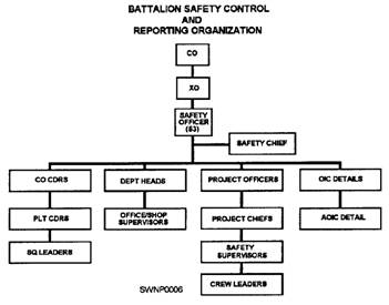SAFETY RESPONSIBILITIES Figure 1-7 shows the Battalion Safety Control and Reporting Organization. As a crew leader, you will report to the safety supervisor, who directs the safety program of a project. Duties of the safety supervisor