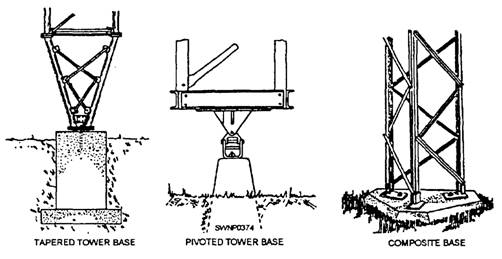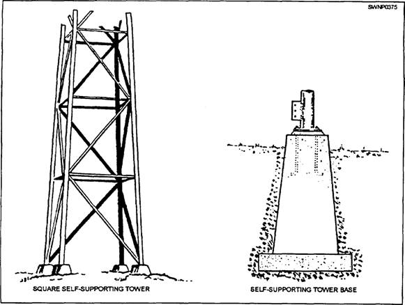 ANTENNA TOWERS Modem communications in different parts of the world between ships, shore stations, and aircraft, including the United States aerospace efforts, have required that transmitting and receiving facilities be erected all over the globe. Many times the Steelworkers from battalion detachments will be assigned to erect them. This section will describe some of the common communications antenna towers that are erected and the procedures for erecting them. GUYED TOWERS The most commonly used guyed towers are fabricated from steel in untapered sections 10 to 20 feet long. These constant dimensional sections are erected one above the other to form the desired height. Structural stability for this type of tower is provided by attaching guy wires from the tower to ground anchors. Base supports for guyed towers vary according to the type of tower to be installed. Three commonly used base supports are the tapered tower base, the pivoted tower base, and the composite base. All three are shown in figure 8-30. A tapered tower base concentrates the load from multiple tower legs to a small area on the foundation. The pivoted base is used primarily on lightweight structures for ease of tower erection. A composite base is generally used with heavier towers because it affords much greater supporting strength than the other two types. Sections for lightweight towers are usually assembled before delivery, to expedite final tower assembly, whereas heavier weight towers must be assembled completely in the field. Tower bracing should include diagonal bracing and horizontal struts in the plane of each tower face for the full tower height. FREESTANDING TOWERS Freestanding, or self-supporting, steel antenna towers are characterized by heavier construction than guyed towers and by a shape that tapers in toward the top from a wide base. Freestanding towers exert much greater weight-bearing pressure on foundations than most guyed towers. Consequent y, deeper foundations are required (because of the greater size, the weight, and the spread of tower legs) to provide sufficient resistance to the uplift. Each leg of a freestanding tower must be supported by an individual foundation. Figure 8-31 shows a typical individual foundation for a freestanding tower, and figure 8-32 shows a foundation plan for a triangular steel freestanding tower. Bracing and material specifications for these towers are the same as for guyed towers. TOWER ASSEMBLY Advance planning for tower assembly and erection is essential for completion of the project safely and correctly. Both the installation plan and the manufacturers' instructions should be studied to gain a complete understanding of the tower assembly and erection methods to be used. The following general procedures and practices should be observed for the assembly and erection of towers: 1. Assemble the tower sections on well-leveled supports to avoid building in twists or other deviations. Any such deviations in one section will be magnified by the number of sections in the complete assembly.