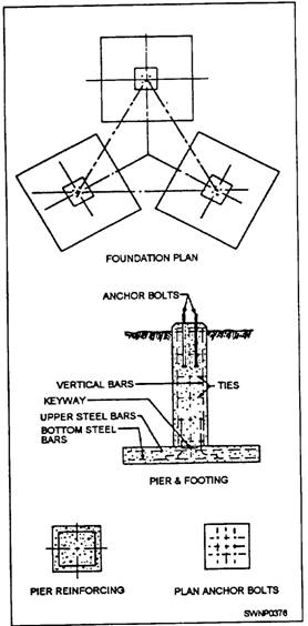 Figure 8-32.-Triangular tower foundation. will be determined by the size, the weight, and the construction characteristics of the tower and by the hoisting equipment. Davit Method Lightweight guyed towers are frequently erected with a davit hoist that is anchored to the previously erected section, providing a pivoted hoisting arm. The davit arm is swung away from the tower in hoisting the added section and swung centrally over the tower in depositing the section before bolting up the splice plates. Figure 8-33 shows a ground assembled unit being hoisted for connection to a previously erected tower section. A snatch block, secured to the tower base, transmits the hoisting line to a source of power