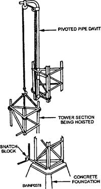 Figure 8-33.-Typical davit installation. or hand winch. A tag line, secured to the base of section being hoisted, avoids possible contact with the erected portion of the tower. Gin Pole Method Light triangular guyed towers, furnished with a pivoted base, may be completely assembled on the ground and then raised to a vertical position with the aid of a gin pole. Figure 8-34 shows the lower section