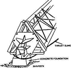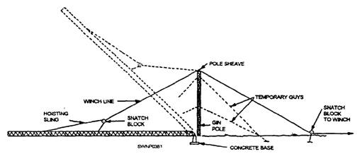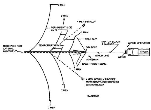 Figure 8-35.-Erection plan for a pivoted tower. of a tower that has an attached pivoted base in a horizontal position preparatory to hoisting. The thrust sling shown counteracts the thrust on the base foundation from hoisting operations. Rigging operations and location of personnel essential to the raising of a pivoted base tower are detailed in figures 8-35 and 8-36. Light towers in lengths of approximately 80 feet may be raised with a single attachment of the winch line. However, longer towers frequently are too flexible for a single attachment, and, in this case, a hoisting sling, furnished with a snatch block, allows for two points of attachment. The gin pole is mounted close to a concrete tower base and is provided with atop sheave to take the winch line. Permanent guys, attached to the tower at three elevations, are handled by personnel during hoisting operations, as shown in figure 8-35. Temporary rope guys, provided with a snatch block anchored to deadmen, furnish the necessary lateral