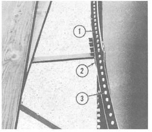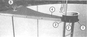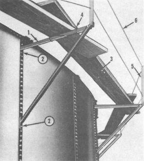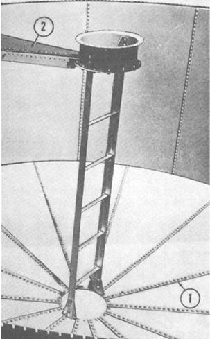 Figure 9-13.-I.ocation of the scaffold around the top chime of the staves. into the stave joint channels to ensure proper tightening of the nuts. LAST STAVE. - To assist in the installation of this stave, push all of the bolts (fig. 9-12, #2) in the chime of the bottom flush with the gasket to provide clearance for sliding in the last stave. Set the stave in position with the left seam outside the right seam of the next-to-last stave and the right seam inside the left seam of the first stave. Loosen the bottom chime nuts of staves #2 and #3. Lift the first stave #3 slightly, so the bottom chime of the stave #1 slips into place. Use driftpins and align the holes and the bolts in staves #1, #2, and #3. Install the nuts on the bolts in the chime of the bottom. Install 1-by 1 1/2-inch bolts (fig. 9-13, #2) in the third and twentieth bolt holes of the vertical seam, counting down from the top chime of every stave. These are scaffold-mounting bolts. Install the remaining bolts in all of the seams. Install the gaskets and washers with the cup side down over the gaskets
