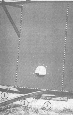 Figure 9-14.-Removing the timber blocking. on all of the seam bolts. Apply the nuts with the rounded face down to all of the bolts. Do not tighten. Tighten all of the chime bolts uniformly. Remove the blocking (fig. 9-14); place it under the chime of the bottom. Use a heavy, long timber as a lever and a short timber as a fulcrum to lift the chime. lighten all of the seam bolts. Be careful not to crush the gaskets. Apply a sealing compound to the inside perimeter of the bottom chimes of the staves. DRESSING TOP CHIME.- Use the scaffold and install the strip gasket to coverall of the bolt holes (fig. 9-15). When one roll of gasket material is used up and a new one is started, the overlap should extend over two bolt holes. Apply a sealing compound at each end of the overlap. Insert a wedge gasket underneath the gasket at each lap, formed by adjoining staves. Insert 1/2- by 1-inch bolts through the chime and gasket, in that order. The gasket will hold the bolts in place. Ladder Assembly The ladder consists of a bolted steel angle section. The top of the ladder is fitted with a manhole dome. The bottom of the ladder is fitted with ladder anchors, flanged, flat steel plates. The small end of the deck plates is bolted to the bottom flange of the manhole dome. Place two ladder rails (fig. 9-16, #1 and #2) with similar bolting legs facing each other on top of several pieces of blocking of sufficient length to support both rails and spaced wide enough apart to insert a ladder