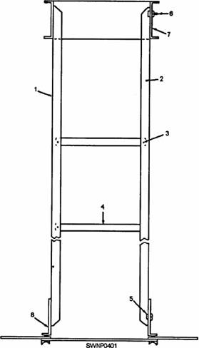 Figure 9-16.-Deck support ladder. step. Determine which end of the roils will be the bottom. Install the steps from the bottom toward the top of the ladder. Five steps make up the assembled section. Insert 1/2- by 1-inch bolts through the ends of the step and rails. Install a nut on each bolt protruding through the rails. Tighten the bolts after all of the steps are installed. Face the 30 bolt hole flange of the manhole dome and slide it over the top of the rails. Use a driftpin and