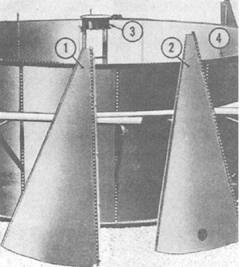 Figure 9-19.-Deck plates ready for installation. Line up two diametrically opposite lap seams (fig 9-18) in the tank bottom. Remove a nut from each bolt in the lap seams and the first bolt to the right and left of each lap seam. Raise the ladder assembly and se the anchors over the bolts. Apply the nuts and tighten Top Deck Assembly The assembled deck consists of 14 tapered, flat steel plates (fig. 9-19) with an integral formed flange along the right lap seam. The seams are identified rig and left, facing the large end All of the plates are interchangeable. Of the 14 plates, three are special. Two plates a fitted with a tank thief and vent, and one plate is fitted with a liquid level indicator. Each deck plate has deck plate channel and a rafter bolt retainer angle assembled on it. The small end of the plates is bolted to the bottom flange of the dome. The large end bolted to the top chime of the staves. |
