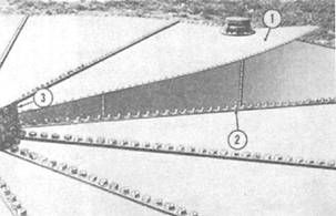 LAYOUT AND ASSEMBLY OF PLATES.- Lay out the plates around the outer perimeter of the tank foundation. Place the blocking on the ground, spaced to fit inside the confines of the plate. Lay the inside of the flange with the short leg facing outward. Insert four equally spaced bolts through the angle and flange. Apply the nuts to the bolts. Tighten the bolts. Turn the plate over with the flange down. Install a gasket along the full length of the right lap seam. Allow a two bolt hole overlap at each end. LAYOUT OF ASSEMBLED PLATES.- As the plates are assembled, raise them up and stand them against the scaffold, as shown in figure 9-19. Locate each plate so it straddles a vertical seam of the side staves in the approximate installation position, counterclockwise. ADJUSTMENT OF CENTER SUPPORT LADDER- Check and adjust the ladder to the correct height before the installation of the deck plates. `he distance from the top of the tank bottom to the outer face of the top flange of the dome is 9 feet 6 9/64 inches. Raise or lower the ladder as required. Place a jack under one of the ladder steps. Adjust the ladder so that in the final position, one set of the holes in the bottom of the rails line up with the holes in the brace. Lock the jack Insert the bolts through the proper bolt holes in the brace to match the top holes in the rails. Apply the nuts to the bolts. Tighten the bolts. Unlock and remove the jack. When all of the deck plates have been installed on the tank, check the height to the outer face of the top flange of the manhole dome above the top of the tank bottom. If not the required height, adjust the ladder until it is the correct dimension. Insert the bolts in aligned bolt holes and tighten the nuts. INSTALLATION OF FIRST DECK PLATE.- The first plate installed should be a plate with a vent (fig. 9-19, #2). The remaining plate, fitted with a vent, must be installed directly across the tank from the first plate with a vent. Attach two rope deck hooks to the small end of the plate while it stands against the scaffold (fig. 9-13). Guide the large end of the plate and pull the plate in place by means of a haul line. Lower the large end of the plate over the proper bolts in the top chime of the staves, so it will straddle a vertical seam. The small end of the plate will drop over the proper bolts. Release the hooks. Apply four equally spaced catch nuts to the bolts through the large end of the plate. One catch nut will be sufficient to hold the small end in place. Do not tighten the bolts. INSTALLATION OF SECOND DECK PLATE.-Install a gasket over the bolts at the left lap seam of the plate (fig. 9-17, #3 and #4). Face the small end of the plate #4. Install this plate and all of the remaining plates to the left of the first plate or in a counterclockwise direction around the tank Raise the plate. Place the right lap seam of the plate over the bolts in the left lap seam of the first plate #4 and the large end over the proper bolts in the top chime of the staves. Install the nuts to six equally spaced bolts in the lap seam of the plates. Install the nuts on all of the bolts in the chime. Finger tighten all of the nuts. As the deck will have to be adjusted as the plates are installed, do not tighten any bolts until the deck is completely installed. Raise or lower the center support ladder as required to fit the plates in place. INSTALLATION OF INTERMEDIATE DECK PLATES.- There are 12 intermediate plates. The special plates remaining are installed to suit field conditions. LAST DECK PLATE.- Raise the last deck plate before the next-to-last plate is installed Raise the right lap seam of the first deck plate (fig. 9-20, #1). This is necessary to permit the installation of the last plate.