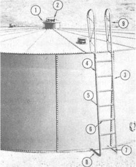 Figure 9-21.-Outside ladder installed. The left lap seam of the last plate slips under the right lap seam of the first plate. The right lap seam of the last plate is placed over the bolts in the left lap seam of the next-to-last plate installed. Make the necessary adjustments in the deck if the last plate fails to fit properly. Remove the nuts temporarily installed on all of the bolts in the plate lap seams. Install a rubber gasket, a steel recessed washer, and a nut on all of the bolts except on the bolts in the top chime of the staves. Install any missing nuts on the chime bolts. Make sure that the rounded head of the nut is against the plate and washers and that the cupped side of the washer is facedown covering the rubber gasket. Tighten the bolts. Remove the scaffold. Install the gaskets, the washers, and the nuts to all of the bolts in the vertical seams. Return the brackets and the posts to the tank erection tool set. MANHOLE COVER If this tank is used for water storage, omit the emergency vent valve (fig. 9-21). Install the manhole cover with the blind flange hatch set after installation of the manhole air intake. Install a 30 bolt hole gasket on the top flange of the dome. Insert 1/2- by 1 1/2-inch bolts through the flange and gasket, in that order. The gasket will hold the bolts in place. Install a 30 bolt hole manhole cover (fig. 9-21, #1) over the bolts. Install the gasket, the washer, and the nut on all of the bolts. Install the washer and the nut as above. Tighten the bolts. |