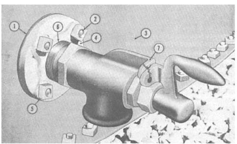 Water Drawoff Valve The valve assembly consists of a commercial 2-inch bronze valve made up in a cast-iron flange with a gasket installed outside the tank. A one-piece, flanged cast steel elbow with a gasket is installed inside the tank. The valve and elbow bolt together through the side of the tank FLANGED ELBOW.- Install the elbow (fig. 922, #1) inside the tank on the stave. Cut four one-hole gaskets. Force the gaskets over the bolts. Insert the bolts through the flange of the elbow. Place the blocking under the heads of the bolts. Force a gasket over the bolts. Turn the inlet of the elbow toward the tank bottom. Insert the bolts through the stave. Install the nuts temporarily on two bolts while you are assembling the valve. Remove the nuts before installation of the valve. DRAWOFF VALVE.- Hold the elbow (fig. 9-22, #1) in position inside the tank. Install a gasket (fig. 923, #1) over the bolts. Install the outside flange over the bolts. Install the nuts on the bolts. Tighten the bolts. Install the made-up valve inside the flange. With