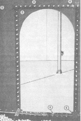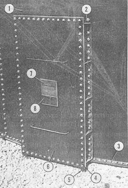 Figure 9-25.-Cleanout cover installed. the frame in place. Install the frame with the radiused flanges over the bolts with the flange against the outside of the stave. As the frame straddles a lap seam, make sure a wedge gasket is under the gasket at the seam. Work the bolts through the bottom flange of the frame. Install the nuts temporarily or enough bolts to hold the frame in place. Install the gasket and the washer with the cup side down over the gasket on all of the seam bolts. Omit the gaskets and the washers on the chime bolts. Apply the nuts with a rounded face down on all of the bolts. Tighten them uniformly around the frame to maintain a leakproof joint. CLEANOUT COVER- Work from the back and insert 1/2- by 1-inch bolts through the front flanges of the frame. Install the gasket along the full length of each row of bolts in the top and the bottom flanges. Allow a one bolt overlap at each end. Install the gasket along the full length of each row of bolts in the side flanges. Press the gaskets over the top and the bottom flange gaskets. Allow a one bolt hole overlap ate each end. Apply a heavy coating of sealing compound at the overlap of the top and the side flange gaskets. Stand the cover (fig. 9-25, #6) in position with plates #7 and #8 set for direct reading, and slip the cover over the bolts. Install the gasket and the washer with the cup side down over the gasket on all of the bolts. Apply the nuts with a rounded face down on all of the bolts. Tighten the bolts uniformly around the cover to maintain a leakproof joint. Cleaning Site The tank erection crew must clear out all of the debris, paper, and any other matter of an inflammable nature, leaving a clean and neat installation for the pipeline crew or others. All of the tools and other erection equipment must be picked up and returned to the tank erection tool set. |