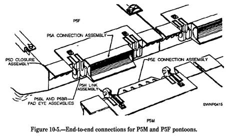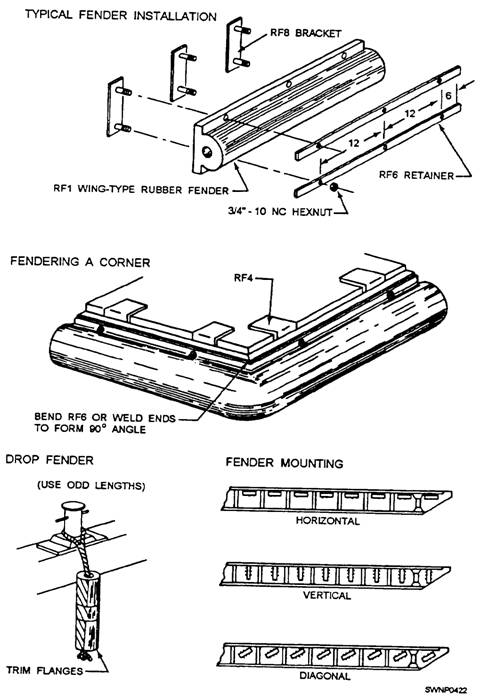 Figure 10-12.-Typical fender installations. acceptable substitute for the AP5 can be field-fabricated, if necessary, from an API. To do so, remove the holes from the API by cutting 3" inside the two edges measuring 18 1/4", and halve the resulting 18 1/4" x 5" plate to produce two 9 1/8" x 5" plates; both can be used as end plates. AP6 CHAFING PLATE: The AP6 is a steel plate. 10" square, with two opposite edges beveled. Welded to the sides of causeway sections, the AP6 protects the causeway from damage due to sliding contact. It is frequently used between side-lapped causeway sections. Because the AP6 is a nonstock item, it should be fabricated in the field when it is required. Dimensions are not critical; halves of an API or an AP7 plate will serve as chafing plates when properly beveled. AP7 GUSSET PLATE: The AP7 is a steel plate cut in the form of a 9" high trapezoid. The parallel edges are 18" and 12" long, and the 18" edge has a 1/4" bevel. The AP7 reinforces the end-condition angles used at the fore and aft ends of larger structures. The 18" edge is positioned against a tip or bottom assembly angle so the plate bridges the gap between the pontoons to which the angle is bolted. The 18" edge is welded to the angle, and the two vertical edges are welded to the adjacent pontoons. API connecting plates can also be used for reinforcing, welded to end-condition angles in the same way as the AP7. AP8 RAMP-END BENT PLATE: The AP8 is fabricated from steel plate. An 11" x 20 1/4" rectangle is bent to form two legs, one 8 5/8" and the other 11 5/8" long; each leg has two drilled holes for A6B bolts. The AP8 is used for connecting pontoon strings at the point where each string has a P3 sloped-deck ramp pontoon connected to a P1 pontoon. |