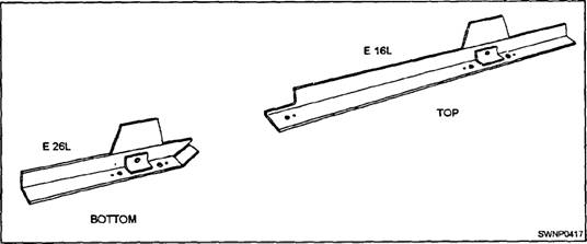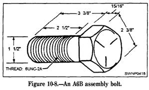 Figure 10-7.-Assembly angles E 16L and E 26L. angles of the strings. On the other hand, end-condition angles connect P2, P3, or P4 pontoons to the ends of strings, and each is designed for a specific orientation-top or bottom and right or left. Basic angles can be shortened or lengthened to make up modified configurations, and end-condition angles can be cut and formed from basic angles to meet abnormal operating requirements. The A6B ASSEMBLY BOLT is a 1 1/2" diameter x 3 3/8" long, hexagonal head, steel bolt (fig. 10-8). Three radial grooves on the head, spaced 120 degrees apart, are the code for grade 5 steel rated at a tensile strength of 105,000 psi. In addition to its use in securing assembly angles to pontoons ate each comer, the A6B bolt is also used to connect strings into structures, to secure deck fittings and accessories, and to pin hinges on dry dock stabilizer towers. The forged FNI FLANGED NUT (fig. 10-9) is designed to fit into a pontoon pocket with sufficient clearance to allow positioning on the A6B assembly bolt. The flange of the nut is large enough to prevent the nut from turning in the pocket when the bolt is tightened; it is formed near the midline of the nut to clear welds in the pocket and allow positive se sting of the nut boss when the A6B bult. is tight.