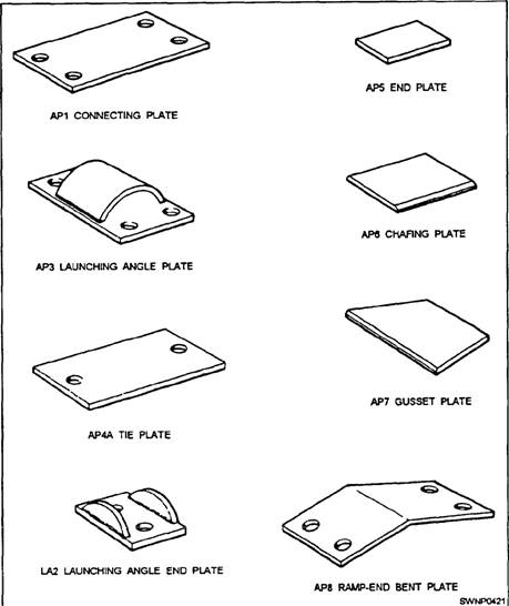 Figure 10-11.-Assembly plates. NOTE: As of this printing LSTs are being decommissioned and it is undecided what platform will transport causeways. The information on LSTs is given because the Reserve Fleet will retain two and the next platform used could require the same hardware for loading and launching. AP4A TIE PLATE: The AP4A is a steel plate with two drilled holes for A6B bolts. It is used for connecting pontoon strings to each other at their bow and stem ends. If necessary, an acceptable substitute for the AP4A can be obtained by cutting an API connecting plate in half across the narrower dimension; two plates are produced, both of which can be used. LA2 LAUNCHING ANGLE END PLATE: The LA1 launching angle used when side-loading a pontoon structure on an LST is attached to the structure at the bow and stem ends with a two-hole assembly plate, just as pontoon strings are connecteed within the structure by the two-holed AP4A at the bow and stem. The two drilled holes in the LA2 are for A6B bolts. Two half-ovals are welded perpendicularly to the upper face of the plate, on either side of the bolt holes. These half+oval lugs serve as fenders to protect the hull of the LST in the same way as the pad on the AP3. AP5 END PLATE: The AP5 is a steel plate that is welded across the gap between pontoons at the bow and stem of adjacent strings. It is used only in certain special cases where structures require extra reinforcement; for example, where end connectors are used or where the structure will be side-launched. An