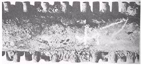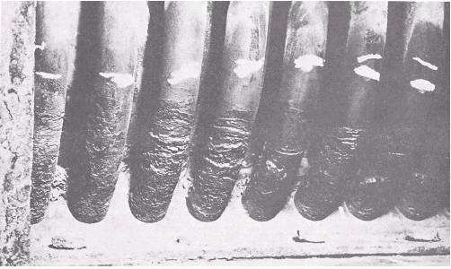 Figure 12-9.-General fireside circumferential grooving. down the header and onto the tube ends, or as it drips directly onto the tubes. This kind damage is greater on the top of the tube than on the underside, but the groove may extend the entire circumference. Fireside circumferential grooving may also occur on vertical generating tubes as a result of thin, damp deposits of soot on horizontal drums or headers. In fact, this kind of grooving can occur in any part of the boiler where leakage provides a sufficient supply of water. Large quantities of water trapped between the water drum and the boiler casing-as, for example, from a serious economizer leak-can produce general fireside grooving around the bottom of the rear generating tubes. An example of this general fireside circumferential grooving is shown in figure 12-9. CRATERS are deep, irregular, straight-walled cavities in the tube metal. WATER TRACKS are closely related to craters; the tracks consist of wandering, straight-walled, canyon-like cavities in the tube metal. Both cratering and water track-ing occur almost exclusively at the header ends of water wall tubes and division wall tubes that are surrounded by refractory; they are caused by water becoming trapped between the tube metal and the surrounding refractory. Water washing of boiler firesides, without proper drying out, is a frequent cause of cratering and water tracking; of however, any leak higher in the boiler can also cause this type of damage. The size of the leak around and the angle of the tube upon which the water leaks determine, to a large extent, whether the resulting damage will be circumferential grooving, cratering, or water tracking. Both cratering and water tracking are shown in figure 12-10. GENERAL FIRESIDE THINNING consists of a uniform loss of metal over a relatively large area on the outside of the tube. Soot corrosion is by far the most common cause of general fireside thinning. The parts that are particularly subject to this kind of damage are superheater
