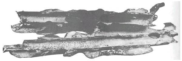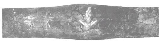 Figure 12-22.-Lamination of a tube wall (fabrication detect). MECHANICAL FATIGUE CRACKS occasionally occur in boiler tubes from such purely mechanical processes as flexing. Cracks of this type can usually be identified by a clean, bright break through a major portion of the metal thickness. These cracks begin on the outside circumference of the tube. TUBE WALL LAMINATION is shown in figure 12-22. This lamination or layering occurs during the fabrication of the tube. It is the most common material defect found in boiler tubes. FOLDED or UPSET TUBES are a result of defective fabrication. A folded tube is shown in figure 12-23. This defect resembles a heat blister in appearance, but the folded tube shows no wall thinning and has a depression on the side of the tube opposite the bulge. STRETCHED or NECKED TUBES are also a result of defective fabrication. A stretched or necked tube is shown in figure 12-24. |