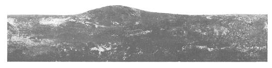 Figure 12-20.-Heat blister on a fire row tube. HEAT BLISTERS differ from tube enlargements in that they affect only one side of the tube, usually the side toward the fires. Blisters appear as egg-shaped lumps on the fireside. They indicate that the tube has been heated to the softening point and has blown out under boiler pressure. Heat blisters always indicate the presence of waterside deposits. If the deposit is brittle, as scale or baked sludge, blistering breaks the deposit and allows the boiler water to quench the hot metal before the tube bursts. Heat blisters are most commonly found on the fire row generating tubes; they are rarely found on superheater tubes or economizer tubes. A typical heat blister is shown in figure 12-20. SAGGING is the term applied to tubes that appear to have dropped downward toward the furnace under their own weight. This type of deformation results from semiplastic flow of the tube metal, caused by extremely mild overheating. A momentary condition of low water is probably the most common cause of sagging. If the boiler has been cooled slowly, and if the distortion is not so severe as to interfere with the designed flow of combustion gases, sagged tubes may still be continued in service. WARPING is similar to sagging except that the distortion is haphazard rather than in one direction. Warping usually occurs as a result of sudden cooling of the tubes after they have been overheated. Cooling a boiler too rapidly after a lowwater casualty is a typical cause of warped tubes. MELTING can occur as a result of a serious low-water casualty. If the tube temperature becomes high enough, the tube metal actually melts and runs down into the furnace. A cluster of fused tubes that resulted from melting is shown in figure 12-21. Melting of aluminum economizer parts can cause tremendous damage to a boiler. The molten aluminum from overheated economizer parts reacts so violently with the iron oxide coating on the steel tubes below that the heat of the chemical reaction may melt the steel tubes even though the furnace temperature is not high enough to melt them.
