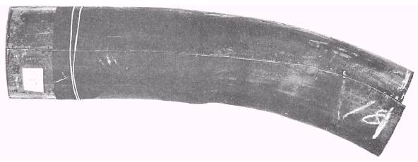 Figure 12-24.-Stretched or necked tube (fabrication defect). metal. The accurate identification of tube deposits is often a necessary part of determining the cause of tube failure. FIRESIDE TUBE DEPOSITS include soot, slag, corrosion products, and high-temperature oxide. SOOT is a broad term used to cover all of the ash products (other than slag) that result from combustion. These ash products include carbon, sand, salts such as sodium sulfate, and other materials. Soot deposits are usually powdery or ashy on the tube surfaces near the top of the boiler; but they tend to be packed solid on drums, headers, and the lower ends of the tubes. SLAG is not a powdery or packed ashlike soot; rather, it is a saltlike material that is fused to the tube surfaces. Slag is objectionable on boiler tubes because it retards the transfer of heat to the tube metal and because it may cause gas channeling, with consequent local overheating of tube metal that is not covered by the slag. Most slags on boiler tubes are soluble enough to be controlled by periodic washing of firesides. The main way to prevent slag is to avoid burning fuel oil that is contaminated with seawater. CORROSION DEPOSITS seldom form major fireside deposits. Occasionally, however, bulky deposits of ferrous sulfate may form as the result of the combination of soot and large amounts of water. These deposits have been known to travel away from their original location and adhere to remote rows of generating tubes. The deposits can usually be removed by water washing and mechanical cleaning. The source of the water leakage should be found and corrected. Also, the location of the original deposit should be found, and the area should be carefully inspected for signs of corrosion. HIGH-TEMPERATURE OXIDE is the term applied to heavy fireside layers of mixed iron oxides formed by overheating of the tube metal. Low water is a frequent cause of high-temperature oxide on the tube firesides. The high-temperature oxide has a rather layered appearance; it resembles corrosion products and is often wrongly called scale. |