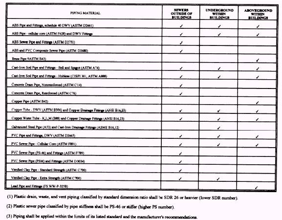 PLANNING, ESTIMATING, AND SIZING PLUMBING SYSTEMS You will provide input on the planning, estimating, and sizing of plumbing systems. This input may concern installation techniques, types of material required, quantity and size of piping or fittings, and so forth. This section provides information you must consider for planning and estimating a plumbing project. The National Standard Plumbing Code, military specifications, and job specifications provide more concise information. SANITARY SYSTEMS Various types of pipe and fittings are used for sanitary waste and drainage. However, the location of the installation determines the type of material you must use. Threaded pipe that is underground requires coal tar protection. Install underground sanitary waste and drainage lines in a separate trench from the water-service line. The underground water service and the building drain or sewer should not be less than 6 feet apart horizontally and placed on undisturbed or compacted earth. When separate systems of sanitary drainage and storm building drains are placed in one trench, they should be placed sideby-side. A building sewer or building drain installed in fill dirt or unstable ground should be made of cast-iron soil pipe, except that nonmetallic drains may be used when laid on an approved continuous supporting system. Table 7-1 depicts code requirements for pipe usage. Table 7-1.-Sanitary Waste and Drain Piping