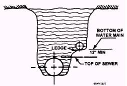 Pay special attention to the joints so roots do not grow into the piping. The depth of the piping should be below the frost line. Also, you should encase the piping with concrete or sleeve it with a metallic material when laying piping under roadways. It may be necessary to install the building sewer and the water-service pipe in the same trench (fig. 7-1). If so, use the following precautions: