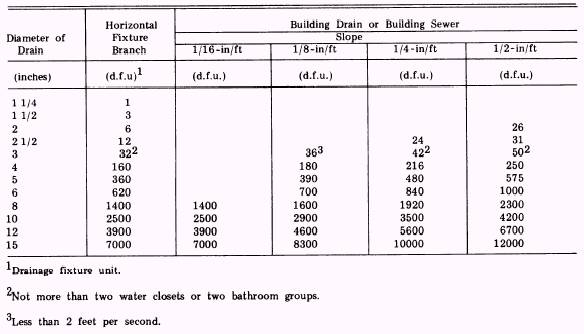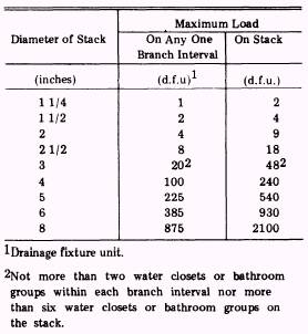 Sizing Stacks and Branches The term stack is used for the vertical line of soil or waste piping into which the soil or waste branches carry the discharge from fixtures to the house drain. A waste stack carries liquid wastes that do not contain human excrement; a soil stack carries liquid wastes that do. Most buildings do not have separate soil and waste stacks. A single stack known as the soil and waste stack, or simply the soil stack, serves to carry both soil and waste material. Soil stacks are usually made of cast-iron pipe with caulked joints. They may, however, be made of other materials Table 7-3.-Maximum Loads for Horizontal Drains