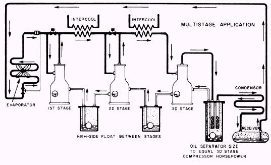 Compound System 1. The condenser of system 2 is shown at point The compound system uses two or more compressers connected in series in the same refrigeration system. In this type of system the first stage also indicated in the figure. Notice the use of oil separators to minimize the circulation of oil. D in the figure. Two TEV refrigerant controls are compressor is the largest and for each succeeding stage the compressor gets smaller. This is because