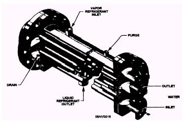 as the refrigerant passes through each compressor, it becomes a more dense vapor. A two-stage compound system can attain a temperature of approximately -80F. A three-stage system, like the one depicted in figure 14-9, can attain a temperature of -135F efficiently. Compressor 1 pumps vapor into the intercooler and then into the intake of compressor 2. This operation is repeated between the second and third stages. In the third stage, the refrigerant vapor is further cooled and travels to the evaporator for specific cooling use. MECHANICAL COMPONENT SELECTION There are several mechanical components required in a refrigeration system. In this section, we discuss the four major components of a system and some equipment associated with the major components. These components include condensers, evaporators, compressors, refrigerant lines and piping, refrigerant capacity controls, receivers, and accumulators, CONDENSERS There are several condensers to be considered when making a selection for installation. They are air-cooled, water-cooled, shell and tube, shell and coil, tube within a tube, and evaporative condensers. Each type of condenser has its own unique application. Some determining factors include the size and the weight of the unit, weather conditions, location (city or rural), availability of electricity, and availability of water. For example, is electricity available in single phase or three phase? Is electricity economical or prohibitive? Water in some locations may be scarce, expensive, or contain chemicals that make it unsuitable for use. Local zoning laws should also be checked to ensure there are no restrictions as to use of electricity, water, or location of the unit. If you installed a unit on a roof, the roof load strength is very important. In some locations, the noise factor of an operating unit is an important consideration. With the rapid advances in technology, you should contact a manufacturer whenever possible to get the latest condenser design features available for a special-purpose installation. Figure 14-10 shows a typical installation of an air-cooled condenser mounted on a compressor unit. Figure 14-11 shows a cutaway view of a water-cooled condenser.