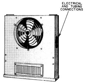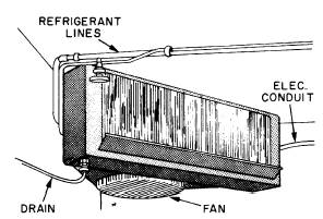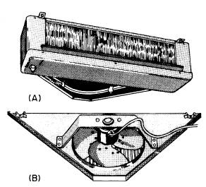 Figure 14-13.-(A) Forced circulation evaporator partially installed; (B) fan unit removed. requirements and select the proper evaporator from a manufacturer's catalog or manual. In figure 14-12 a blower-type evaporator is shown in a small space. The air enters the bottom of the evaporator, is cooled, and exits at the front of the unit. In figure 14-13, view A, a forced circulation evaporator is shown partially installed; view B shows the unit with the fan removed. A compact blower evaporator for use in low headroom fixtures is shown in figure 14-14. A vertical, flat-type blower evaporator designed for mounting behind either a window or a door frame is shown in figure 14-15. In the evaporator