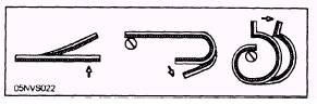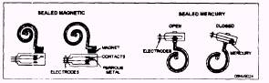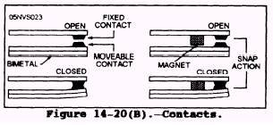 Figure 14-20(A).-Bimetal profiles. The bimetal element in 14-20(B) has a set of contacts on one end. The top contact is fixed. When the temperature changes around the bimetal, the two contacts open or close. When the contacts close, a path is created for current to flow. The snap action in the magnetic type makes the contacts close or open quickly. This eliminates any spark and extends the life of the contacts. Figure 1420(C) shows enclosed contacts that use a