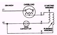 PERMANENT SPLIT-PHASE The permanent split-phase motor has limited starting torque and is used basically with capillary tube air-conditioning equipment, such as window units. Capillary systems permit high-side and low-side pressure equalization when the compressor is not operating. A run capacitor is wired in series with the starting winding. Both the starting winding and the run capacitor remain in the circuit during operation. No start relay or start capacitor is needed. Figure 1428 is a schematic wiring diagram of the circuits used in this type of motor. SPLIT-PHASE HERMETIC MOTOR WINDINGS AND TERMINALS Split-phase motors used in hermetic refrigeration and air-conditioning applications are designed to start under load. These splitphase and capacitor motors use two sets of spiral windings: a starting winding and a running winding. The two sets of windings differ in their impedance and in their positions in the stator slots. The starting winding has high resistance and small reactance, whereas the running winding has low resistance and high reactance. Reactance is the opposition to the flow of alternating current by inductance and capacitance. The running winding has many turns of large wire and is placed in the bottom of the stator slots. The starting winding is wound of small, high resistance wire and is placed on top of the running winding. Both windings are connected internally at one end to provide a common lead, and when starting, both are energized in parallel. The currents are out of phase with each other and their combined efforts produce a rotating field that starts the motor.