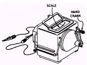 l With the ohmmeter set on its highest scale, test for continuity between the terminals and the shell. This procedure is shown in figure 14-33. If continuity exists between the terminals and the shell, there is a ground. Test Lamp Continuity Check (Low-Resistance) Procedure The procedure for conducting a test lamp continuity check is as follows: l Disconnect the power and remove the wires from the motor terminals. l Ensure the lamp is connected in the hot side of the line. Plug the test lamp into a receptacle. l Connect the hot-line probe to a motor winding terminal. l Touch the free probe to the cleaned spot on the shell. Ensure that a good connection is made. If the light illuminates, there is a grounded winding. Megohmmeter (High-Resistance) Test Procedure The megohmmeter (megger) consists of an indicating movement for which current is supplied by a small hand-driven generator. Figure 14-34 illustrates a typical megger used by the SEABEES.