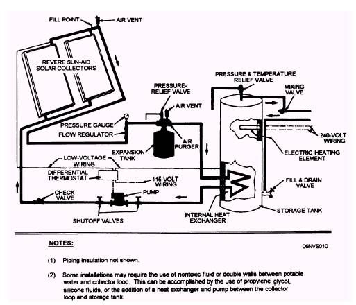 Storage Tanks Water may be stored in a variety of containers usually made of steel, concrete, plastic, fiber glass, or other suitable materials. Steel tanks are commercially available and have been used for water storage. They are available in many sizes and are easy to install. However, steel tanks are susceptible to corrosion and should be lined or galvanized. Dissimilar metal at pipe connections should be separated by high-temperature rubber connections or galvanic corrosion will occur. Steel tanks must be well insulated to reduce heat losses. Fiber glass and plastic tanks are corrosion-resistant and installed easily. They are available in many shapes and sizes. Although many commonly fabricated tanks begin to soften at temperatures above 140F, there are more expensive, specially fabricated tanks available that can withstand temperatures up to 150F. The types of plastics needed to store large quantities of water at high temperatures can be more expensive than steel. Buried tanks must be protected from groundwater and resist buoyant forces. The tank must be reasonably accessible for repairs. In mild or warm climates, an outdoor location may be feasible. Domestic Hot-Water Systems (DHW) Domestic hot-water systems (without space heating) may use lined, insulated, or pressurized tanks similar to the conventional water heater. Appropriate temperature-and pressure-relief valves must be used. Since it is possible for solar collectors to reach hot temperatures, a tempering or mixing valve should be used. A typical two-tank installation with proper valves and connections is shown in figure 15-9. To size the collectors and storage tank, you must estimate the hot-water consumption of the facility or building. The hot water consumption rate for a typical family home is 20 gal/day/person. When the hot-water consumption rate is more than average, use 30 gal/day/person. So, 80 to 120 gal/day should serve a typical four-person family. Thermosiphon Systems A variation of the DHW system is the thermosiphon system. It uses the principle of natural convection of fluid between a collector and an elevated storage tank. The advantage is no pump or controller is needed. The bottom of the tank should be mounted about 2 feet higher than the highest point of the collector. This is the main disadvantage because structural requirements often prohibit the weight of a water tank on a high point of the structure. Also, since the thermosiphon system is connected directly to the potable water supply, it cannot be protected from freezing. A