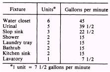 are easily determined by tracing the layout of the water supply system as drawn in a print or sketch. Determining the size pipe you will require to meet the fixture demand of a facility is more complicated and will be discussed in this section. Sizing Cold-Water Supply Systems Some factors that affect the size of the water service in a plumbing system are the types of flush device used on the fixtures, the pressure of the water supply in pounds per square inch (psi), the length of the pipe in the building, the number and kind of fixtures installed, and the number of fixtures used at any given time. The stream of water in a pipe is made up of a series of layers moving at different speeds with the center layer moving the fastest. The resistance to flow is called pipe friction and causes a drop in pressure of the water flowing through the pipe. Friction loss may be overcome by supplying water at greater pressure than would normally be required or by increasing the size of the pipe. The two most important things to consider are the maximum fixture demand and the factor of simultaneous fixture use. The maximum fixture demand in gallons is the total amount of water that would be needed to supply all fixtures if they were being used at the same time for 1 minute. Since it is very unlikely that all fixtures would be turned on at the same time, a probable percentage of the fixtures in use at any given time must be found. This is the factor of simultaneous use. The more fixtures in a building, the smaller the possibility that all will be used at the same time. Therefore, simultaneous use factors decrease as the number of fixtures increase. To estimate the maximum fixture demand in gallons, the number and type of all fixtures in the completed plumbing system must be known. Table 7-8 is used to obtain the maximum fixture demand. For example, assume a plumbing system consists of three urinals, two water closets, one slop sink, two shower stalls, one kitchen sink, one laundry tray, and four lavatories. From table 7-8 a maximum fixture demand of 321 gallons per minute (gpm) can be figured. Normally only a small percentage of fixtures would be used at the same time, so the maximum fixture demand is reduced by applying the factor of simultaneous use. The factor of simultaneous use, also called the probable demand, is only an estimate. Table 7-9 gives data for making an estimate of probable demand. When using this table, take the actual number of fixtures installed, not the fixture unit value. For example, five fixtures would have a probable demand of about 50 percent, while 45 fixtures would have a probable demand of about 25 percent. When a table showing the factors of simultaneous use is not available, a practical way of figuring the probable demand is 30 percent of the maximum fixture demand in gallons. Many factors affect the flow of water through pipes resulting in a loss of water pressure. Difficult calculations are required to consider all the factors involved that may cause a loss of water pressure. These calculations are beyond the range of this manual. For simple systems, approximate figures are acceptable for most plumbing installations. Table 7-10 (for galvanized iron pipe) and table 7-11 (for copper tubing) may be used with the maximum fixture demand and the factor of simultaneous use to find the correct size of pipe for water-service lines. The minimum practical size for a water-service line is 3/4 inch. This size should be used even when calculations show that a smaller size could be used. To continue the example above, the 14 fixtures would have a factor of simultaneous use of about 35 percent. Since the maximum fixture demand was 321 gpm, the water-service line must have a capacity of 35 percent of 321, or 112 gpm. Assuming a length of pipe 60 feet long and a pressure at the main of 40 psi, table 7-10 or 7-11 shows that either a 1 1/2-inch galvanized iron or a 1 1/2-inch copper tubing water-service line would be large enough for the example fixture demand. |