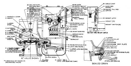 Combined System A combined system (fig. 8-12) is a special purpose arrangement using two modified dry pipe valves connected to tripping devices and piped in parallel to supply water to the same sprinkler system. The piping net work is filled with air under pressure. When a fire is detected, an exhauster at the end of the system opens and releases the air within the system. The system then operates the same as a pre-action system. However, if the detection system fails, the combined system acts the same as a dry pipe system and allows water to be admitted to the system when the sprinklers open, discharging the air from the piping network. |
