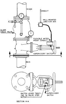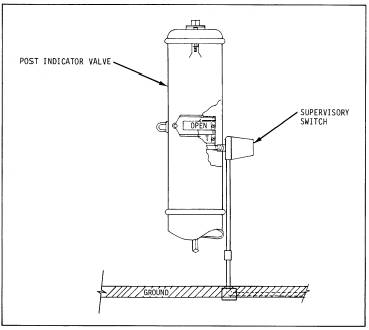 Supervisory Alarm Initiating Devices Supervisory alarm initiating devices cause a signal at the supervisory control unit and/or remote receiver when an abnormal fire protection system condition occurs. In general, supervised valves are never closed unless a sprinkler system requires maintenance. Valves that control water flow to a water-flow detector or valves in a sprinkler header room or fire pump room that are normally closed may be supervised. Supervisory devices for normally open valves signal when the valve is closed no more than two turns or 20 percent of its total travel. Supervisory devices for normally closed valves signal when the valve is opened no more than two turns or 20 percent of its total travel. Outside screw and yoke (OS&Y) valve position indicators (figs. 8-24 and 8-25) are firmly attached to the valve yoke (fig. 8-26). The spring-loaded switchoperating lever or plunger rests in a smoothly tapered notch in the valve stem. When the valve is operated, the stem moves in or out; the lever or plunger moves up the incline at the edge of the notch. The switch is actuated before the lever or plunger is out of the notch. This causes a supervisory signal at the control unit and/or remote receiver. A post indicator valve (PIV) will have a position indicator mounted to it (fig. 8-27). Usually