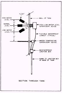of normal limits. Figure 8-29 shows a typical highlow water level supervisory device installed in a sprinkler system reservoir. A pressure-actuated level indicator is physically very similar to the bellows-operated pressure switches used for water-flow detection (fig. 8-21). As the water level changes in a reservoir, the water pressure at the supervisory switch also changes. The switch can be adjusted to actuate when pressure indicates a low water level or a high water level. This device is generally installed in the piping near the bottom of the reservoir. Electronic level indicators may also be found in some systems. These indicators read the conductivity of water to cause an electrical signal. These devices are most frequently used to sense high water levels. They are not commonly used in fire protection systems. Temperature supervisory devices are used to prevent water freezing in fire protection systems.