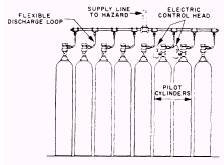 electrical equipment. The nondamaging quality of this agent makes it useful as an extinguishing agent for computer rooms and computer tape vaults. There are two general types of carbon dioxide extinguishing systems, high pressure and low pressure. |