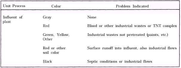 PHYSICAL CHARACTERISTICS The physical characteristics of wastewater include those items that can be detected using the physical senses. They are temperature, color, odor, and solids. Temperature The temperature of wastewater varies greatly, depending upon the type of operations being conducted at your installation. Wide variation in the wastewater temperature indicates heated or cooled discharges, often of substantial volume. They have any one of a number of sources. For example, decreased temperatures after a snowmelt or rainfall may indicate serious infiltration. Changes in wastewater temperatures affect the settling rates, dissolved oxygen levels, and biological action. The temperature of wastewater becomes extremely important in certain wastewater unit operations such as sedimentation tanks and recirculating filters. Color The color of wastewater containing dissolved oxygen (DO) is normally gray. Black-colored wastewater usually accompanied by foul odors, containing little or no DO, is said to be septic. Table 10-2 provides wastewater color information. Table 10-2.-Significance of Color in Wastewater