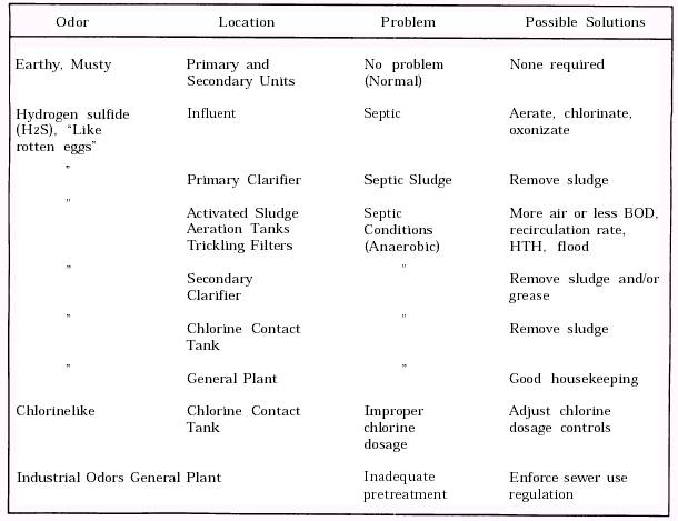Odor Location Problem Possible Solutions Earthy, Musty Primary and No problem None required Secondary Units (Normal) Hydrogen sulfide Influent Septic Aerate, chlorinate, (H2S), "Like oxonizate rotten eggs" " Primary Clarifier Septic Sludge Remove sludge " Activated Sludge Septic More air or less BOD, Aeration Tanks Conditions recirculation rate, Trickling Filters (Anaerobic) HTH, flood " Secondary " Remove sludge and/or Clarifier grease " Chlorine Contact " Remove sludge Tank " General Plant " Good housekeeping Chlorinelike Chlorine Contact Improper Adjust chlorine Tank chlorine dosage controls dosage Industrial Odors General Plant Inadequate Enforce sewer use pretreatment regulation settle are called colloidal particles. Colloidal particles are often removed in the biological treatment units. They may also be removed by chemical treatment followed by sedimentation. All the solids discussed above may be either organic or inorganic. Organic solids always contain carbon and hydrogen and when ignited to high temperatures (500C to 600C) burn to form carbon dioxide, water, and sometimes various other compounds. The burning or volatilization of organic solids has led to the term volatile solids. All solids that burn or evaporate at 500C to 600C are called volatile solids. These solids serve as a food source for bacteria and other living forms in a wastewater treatment plant. Most organic solids in municipal waste originate from living plants or animals. Those solids that do not burn or evaporate at 500C to 600C, but remain as a residue, are called fixed solids. Fixed solids are usually inorganic in nature and may be composed of grit, clay, salts, and metals. Most inorganic solids are from nonliving sources. Table 10-4 summarizes the types and amounts of the solids discussed in the preceding paragraphs. |