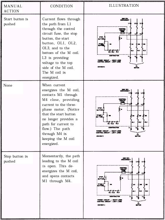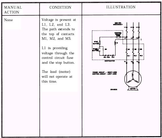OPERATION PROCESS To understand the electrical operation of figure 4-8, you must be able to identify all of the components in the figure. L1, L2, and L3 are the three phases of power. The control circuit fuse is placed in the path of the beginning of the control circuit. Therefore, when excessive current is drawn through the control circuit, the fuse will blow and open the path. The M coil is located in the control circuit, which, when energized, changes the position of contacts labeled with an M. OL1 and OL2 are inline fuses in the load circuit which protect the motor. When OL1 or OL3 opens due to excessive current or too much heat, contacts OL1 or OL3 open, causing the M coil to be de-energized. Follow the logical sequence in table 4-1. It shows the electrical operation of this simple, but actual design, you will see in the field. Table 4-1-Three Phase Motor Controller Circuit