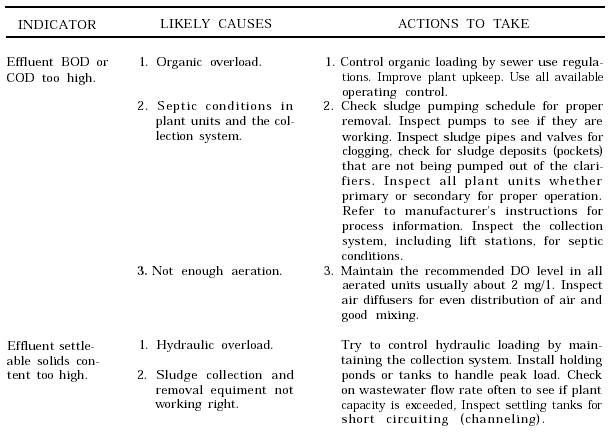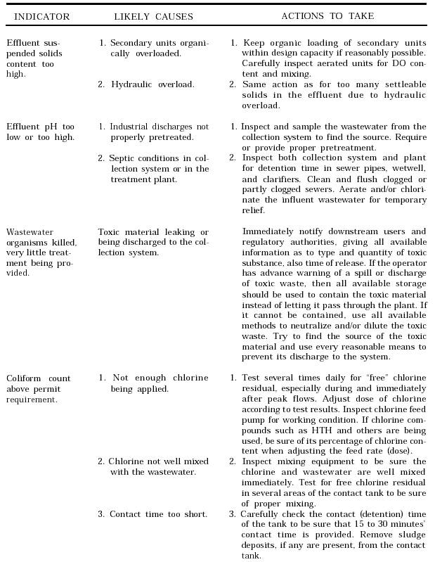 Troubleshooting Table 10-13 describes some problems and solutions for these problems with wastewater effluent. Refer to manufacturers' manuals for more specific troubleshooting and operating guides for various types of treatment plants. Effluent quality usually depends on the operation and maintenance of upstream process units. Odors and unsightly conditions are the most common subjects of complaints. Toxic wastes and wastes with high fecal coliform count are more dangerous but are more difficult to detect. Therefore, fewer complaints are made regarding these two hazards. Complaints must be received with courtesy and investigated at once to see if the complaint is valid. Be sure to inform the complaining person(s) as to your findings, what can be done or what is being done to remedy the problem. A careful investigation may show that the source of the problem is not related to the wastewater treatment plant. If the treatment plant is the source of the problem, use all available operating controls to obtain maximum plant efficiency. Notify designated regulatory officials at once as to the nature of the problem. If the solution to the problem appears to be beyond operator control, request advice and/or assistance. Table 10-13.-Troubleshooting Effluent Disposal