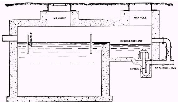 bottom of hopper-bottom tanks. The roof of the tank may be covered with earth, but access openings should extend at least to the ground surface. Although ells or tees may be used at inlet and outlet connections, straight connections are better for rodding. Instead of ells, wooden baffles, located approximately 18 inches from the ends of the tank and extending 18 inches below and 12 inches above the flow line, are provided. Elevations should permit free flow into and out of the tank. The bottom of the inlet sewer should be at least 3 inches above the water level in the tank. The inlet and outlet connections should be sufficiently buried or otherwise protected to prevent damage by traffic or frost. When a tank will discharge into a leaching field greater than 500 feet in length, a dosing tank and siphon should be incorporated into the system (fig. 10-3). The rush of sewage that occurs when the siphon discharges results in better distribution throughout the leaching field. While the dosing tank is refilling, the resultant resting period is favorable to maintaining aerobic conditions in the receiving soil. The dosing tank should have a capacity about 60 to 75 percent of the interior capacity of the leaching pipe to be dosed at one time and should automatically dose once in 3 to 4 hours. Double the amount of dosing siphons for each additional 500 feet of leaching tile or pipe. Although properly designed septic tanks require little operating attention, they must be inspected periodically. The frequency is determined by the size of the tank and the population load. The minimum frequency should be once every 2 months at periods of high flow. The inspection should assure that the inlet and outlet are free from clogging, that the depth of scum and sludge accumulation is not excessive, and that the effluent passing to subsurface disposal is relatively free from suspended solids. A high concentration of suspended solids in the effluent quickly clogs subsurface disposal facilities. Sludge and scum accumulation should not exceed one-fourth the tank capacity. It should not be assumed that septic tanks liquefy all solids, that they never need cleaning, and that the effluent is pure and free from germs. Perhaps 40 to 60 percent of the suspended solids are retained and the rest are discharged in the effluent. Separating sludge and scum from the liquid in septic tanks is difficult. In small tanks these wastes are customarily mixed, and the entire contents are removed when the tanks are cleaned. The