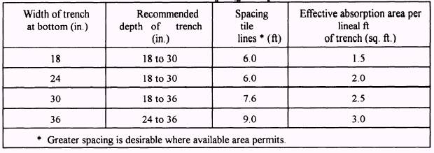 placed in the absorption trench. Figure 10-6 shows a typical layout of a leaching field. The type of soil at the location of the field will dictate the width of the trench. Sand and sandy loam require a width of 1 foot, loam and sand and clay mixture 2 feet, clay with some gravel 3 feet. Note these are minimum trench widths based on the type of soil encountered at the jobsite. Placing the leaching pipe below the frost line to prevent freezing is not necessary. Under no circumstances can you lay leach pipe below the ground water level. When digging the absorption trenches, you must consider the lengths of each lateral and their spacing in relation to each other. Do not make any lateral longer than 100 feet in length. Table 10-17 shows the size and spacing requirements for disposal fields. After the trenches are laid out and dug, filler material must be placed along with the actual pipe. The filler material may be washed gravel, crushed stone, slag, or clean bank-run gravel ranging in size from 1/2 to 2 1/2 inches. Filler material in the trench should not be less than 6 inches deep below the bottom of the pipe. It should be at least 2 inches above the pipe. To prevent backfill soil from filling the voids in the filler material, it is recommended that a 3-inch