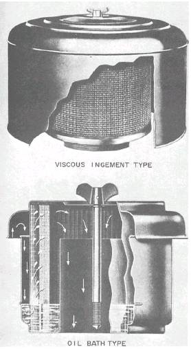 Intake Filters Air filters are provided on compressor intakes to prevent atmospheric dust from entering the cylinders and causing scoring and excessive wear. The two most common types of elements in use are the VISCOUS IMPINGEMENT and the OIL BATH. Both types are illustrated in figure 11-10.