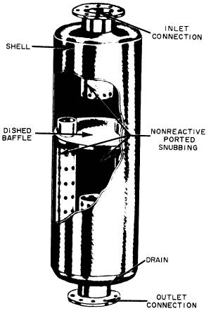 Figure 11-10.-Compressor intake filters. In the oil bath type, air must pass through an oil seal that removes dirt particles, and then pass on through a wire mesh element, which is saturated by oil carry-over. Any remaining particles of dirt are removed by the wire mesh element. Captured dust particles settle to a sump at the bottom of the filter housing. Oil bath filters are recommended where dust concentrations are present in the atmosphere. The viscous impingement filter consists of a wire mesh filter element, which is coated with oil. Air passing through the filter element must change directions many times, causing any dust to adhere to the oil film. Silencers Silencers are similar to mufflers and function simply to eliminate objectionable compressor suction noise. Figure 11-11 illustrates a standard