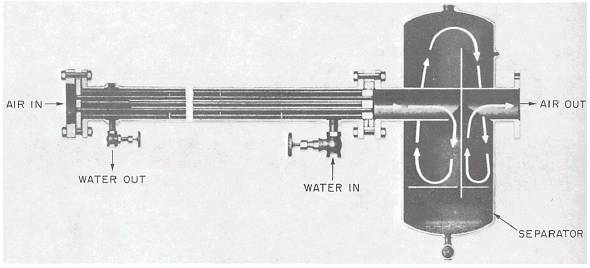 A baffle-type separator is illustrated in figure 11-15. In this unit the air is subjected to a series of sudden changes in direction that result in the heavier moisture particles striking the baffles and walls, then draining to the bottom. Dryers Some compressed air supplies require dryers that ensure removal of all moisture that might otherwise condense in air lines, air-powered tools, or pneumatic instruments. Small amounts of moisture can cause damage to equipment from corrosion, freezing, and water hammer and can result in malfunctions of instruments and controls. The cost of dryers is often justified by the reduction in maintenance costs, production time lost in blowing down piping, and compressed air lost during blowdown. There are three basic designs of dryers: two absorption types and a condensation type. One type of absorption unit consists of two towers, each containing an absorbent material. Reactivation is accomplished by means of electric or steam heaters embedded in the absorbent or by passing driedprocess air through it. Another type of absorption unit consists of a single tank or tower containing a desiccant (drying agent) that dissolves as it absorbs moisture from the air and drains from the unit with the condensate. The drying agent must be replenished periodically. The third type removes moisture from the air by condensation through the use of a mechanical refrigeration unit, or where available, cold water. Inlet air passes over cold coils where moisture is condensed out of the air and is drained from the unit by a trap. This process is illustrated in figure 11-16. Receivers Air receiver tanks in compressed air plants act as surge tanks to smooth the flow of air from the action of the compressor to discharge; they collect excessive moisture that may condense from the cooled air and provide a volume of air necessary to operate the pressure control system. A typical air receiver is shown in figure 11-17. Related components include a relief valve, pressure gauge, drain valve, service valve, and inspection opening.