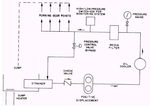 Figure 11-18.-Typical pressure lubrication system. is no single solution to this problem, but some specific guidelines will be discussed below. Pulsation dampeners serve as pulsation and noise mufflers by providing acoustical chambers with the dampener. Manufacturers generally provide dampeners to a specified discharge pulsation peak of 2 percent of line pressure. Figure 11-19 shows several typical pulsation dampeners. These units should be used whenever reciprocating and centrifugal compressors serve the same compressed air main, because the pulsations of the reciprocating compressor can transmit to and disturb the operation of the centrifugal compressor. Pulsation dampeners may not completely solve downstream resonance, but they will reduce the vibration amplitudes. Several other ways to decrease noise and amplification caused by discharge pulsation are available. Surge chambers can be used to change the equivalent length of the piping and increase the pulse-absorbing volume of the pipe. A surge chamber can be as simple as an increased diameter of discharge piping near the compressor discharge. An orifice plate or plates may be installed in conjunction with surge chambers to change the acoustical resonant frequency of the piping system. Piping support is also important at the compressor. They must not only be supported from top or bottom but also have lateral support. When piping is large, provide spring-loaded twoway lateral supports to absorb vibration. Controls Compressor control systems generally include one or more controlling devices, such as safety controls, speed controls, and capacity controls. Such devices function in the system to regulate the output of the compressor as it meets the demand for compressed air. On some small compressors the simple Bourdon tube-type pressure switch serves as a controller by actuating the prime mover on and off over a predetermined pressure range. More complex compressors require control systems that load and unload the compressor as air demands change. The CONSTANT-SPEED type of controller used with many compressors decreases or increases compressor capacity in one or more steps by the use of unloading devices, while allowing the prime mover speed to remain constant. Another type, referred to as the DUAL-CONTROL, is a combination of the constantspeed and an automatic start-stop control. It permits constant speeds when demands are continuous and an automatic stop or start when demands are light. There is still another system that enables the prime mover to idle and compressor suction valves to remain open when air pressure reaches a set maximum. As the pressure drops below a set minimum, the prime mover speed is increased, suction valves are closed, and air is compressed.