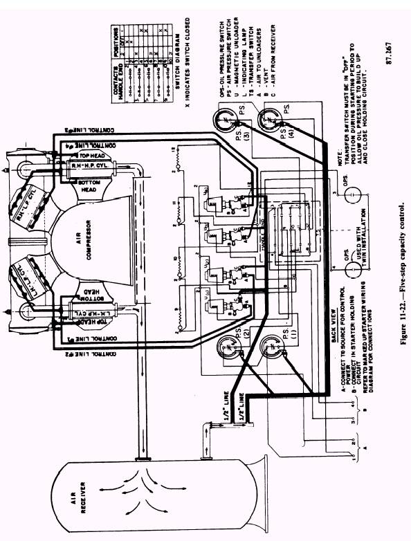 Figure 11-22 illustrates a flow diagram of a five-step capacity control system applied to a twostage, four-cylinder, double-acting, reciprocating compressor. Assuming that the compressor in the figure is required to maintain a pressure of 92 to 100 psi, the pressure switches should be set to load and unload as follows: switch 1, load at 93 psi and unload at 97 psi; switch 2, load at 94 psi and unload at 98 psi; switch 3, load at 95 psi and unload at 99 psi; and switch 4, load at 96 psi and unload at 100 psi. As the receiver pressure reaches the high limit of each pressure switch, 25 percent of the compressor capacity will unload. As receiver pressure falls to the low setting of each switch, 25 percent of the compressor capacity will load. Pressure switch 1 will therefore unload 25 percent of the compressor capacity at 97 psi and will load 25 percent at 93 psi, and so forth. As receiver pressure fluctuates between 93 and 100 psi, the compressor capacity varies in five steps; full, 75 percent, 50 percent, 25 percent, and zero capacity. The compressor illustrated in figure 11-22 operates on the following principle: When it is started, air pressure switches are closed and the solenoids in the unloader valves become energized so that receiver pressure cannot enter the unloading lines, and compression is permitted. As the receiver pressure builds up and reaches 97 psi, pressure switch 1 breaks contact, de-energizing unloader 1, and allowing 97 psi receiver air to enter control line 1, actuating the inlet valve unloader. Twenty-five percent of the compressor has become unloaded and compression has reduced from full to 75-percent capacity. Control lines 2, 3, and 4 will operate in the same way as receiver pressure increases. At 100 psi, all cylinders will be unloaded. Air compression ceases, but the compressor continues to run under no load. As air is drawn off from the receiver, the pressure begins to drop. When the pressure falls to 96 psi, pressure switch 4 makes contact and energizes unloading valve 4, which cuts off receiver pressure from the inlet unloader and vents the unloader pressure to the atmosphere. The inlet valve unloader releases the inlet valve and normal compression takes place, loading the compressor to 25-percent capacity. If the demand for air increases and receiver pressure continues to decrease, control lines 3, 2, and 1 will load in sequence. Another method of unloading a compressor is by the use of clearance pockets built into the cylinders. Normal clearance is the volume at the end of the piston and under the valves when the piston is at the end of the COMPRESSION stroke. Figure 11-23 shows an air cylinder with clearance pockets and clearance valves used with a five-step clearance control. Each end of the cylinder is fitted with two clearance pockets that are connected with or cut off from the cylinder by air-operated clearance valves. A regulated device, not shown, which is operated by receiver pressure, uses pilot valves to open and close the clearance pocket valve in the proper sequence. Each clearance pocket can hold one-quarter of the air compressed by the cylinder in one stroke. When both pockets at the end of the cylinder are open, no air is taken into that end of the cylinder. Figure 11-24 illustrates the operation of clearance pockets under five-step clearance control. |